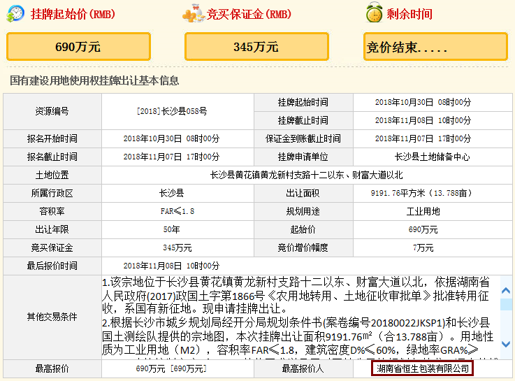 [2018]长沙县058号地位于长沙县黄花镇黄龙新村支路十二以东、财富大道以北,出让面积为9191.76㎡,起始价为690万元,最终湖南省恒生包装有限公司以底价摘得。